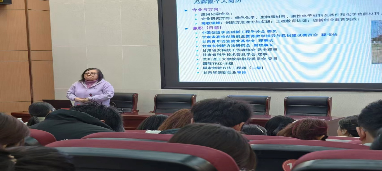 冯辉霞教授作为甘肃省科技领军人才、教学名师,深耕绿色化学与创新教育领域多年,兼具深厚的学术造诣与丰富的实践经验。讲座中,她围绕“瞄准科技前沿激发创新源动力”“依托创新大赛探索双创教育新途径”“以赛促学提升学生综合能力”三大核心板块,结合中国国际大学生创新大赛新规要求,系统剖析了当前双创教育的发展趋势与实践要点。她通过自身主持的国家级科研项目案例、指导学生参赛的实战经验,生动阐释了如何将科技前沿成果与双创教育深度融合,如何通过赛事平台锤炼学生的创新思维与实践能力,为在场师生带来了一场兼具理论高度与实践价值的学术盛宴。