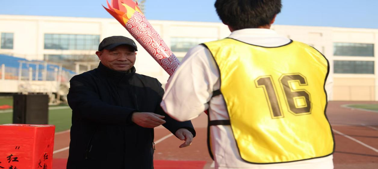 活动现场,火炬手们身着统一服装,精神抖擞地列队等候,一张张年轻的脸庞上写满了庄重与期待。伴随着激昂的旋律,象征着爱国精神的火炬被缓缓点燃,跳动的火焰跃动闪耀,瞬间点燃了在场所有人的热情,欢呼声与掌声接连响起。第一棒火炬手高举火炬率先冲出起点,步伐坚定有力,红色火焰在冬日的赛道上熠熠生辉,成为一道亮眼的风景线。接力区内,选手们严阵以待,完成精准交接、默契配合,掌心相触的瞬间,不仅传递了火炬,更传递了永不熄灭的爱国火种;每一次火炬传递,都是精神的传承;每一次奋力奔跑,都是青春的宣言。赛道两侧,观赛师生挥舞着鲜艳的五星红旗与校旗,呐喊声、欢呼声此起彼伏,整齐响亮的口号声划破冬日的长空,为赛场上的健儿们注入了满满的能量。
