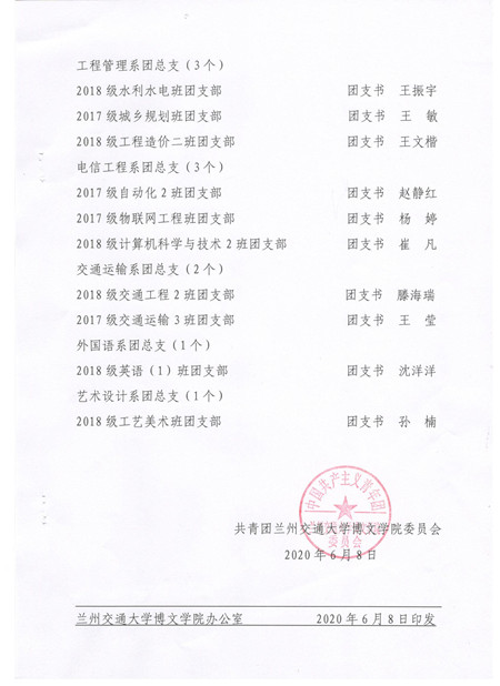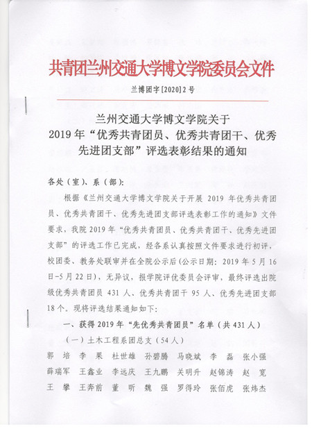 兰州交通大学博文学院关于2019年“优秀共青团院、优秀共青团干、优秀先进团支部”评选表彰结果的通知