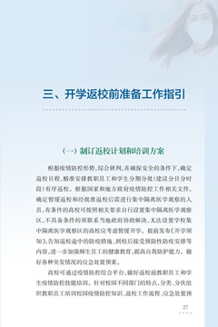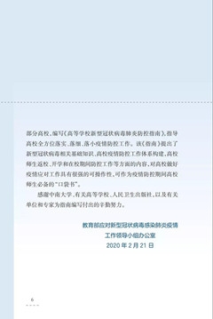 近日,教育部应对疫情工作领导小组办公室委托北京大学、中南大学组织全国相关机构和学校,编写了《幼儿园新型冠状病毒肺炎防控指南》《中小学校新型冠状病毒肺炎防控指南》《高等学校新型冠状病毒肺炎防控指南》。