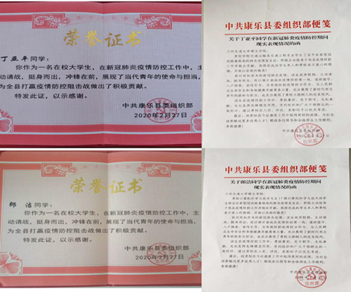 学院17级计算机科学与技术班郎洁同学、19级交通工程班丁亚平同学,充分发挥当代大学生使命与担当自愿参加家乡志愿者工作。负责协助调查小区外来人员、在社区发放通行证、采集小区人员出行情况。虽然岗位很普通、很平凡,但是在抗击疫情的战线上离不开志愿者们无私的奉献!这两位同学受到中共康乐县委组织部的表彰,充分展现了新时代有志青年的使命与担当,也充分展现了我院立德树人的优良校风。