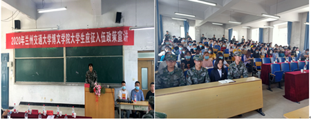 为认真落实省征兵办、省教育厅“2020年甘肃省征兵宣传教育进高校活动”工作要求,鼓励大学生积极参加应征入伍,提高兵员征集质量,推进国防和军队现代化建设,6月24日下午,兰州交通大学博文学院在东梯一教室举办大学生应征入伍政策宣讲活动。参加本次活动的领导有榆中县武装部贺亚军副部长、学院征兵工作站崔科峰老师、各系分管征兵工作的辅导员、老师及学生代表。