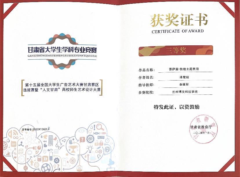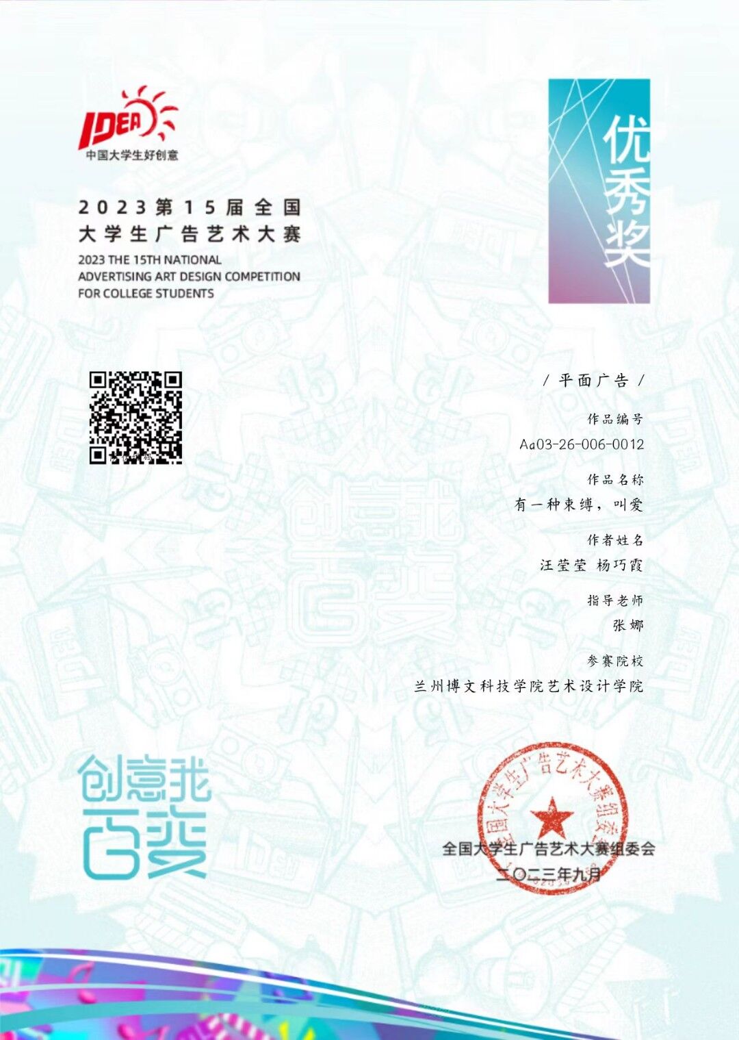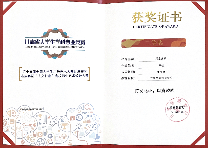 我校艺术设计学院的师生们凭借出色的创意和扎实的专业技能,在此次比赛中取得了优异的成绩。本次大广赛,我院总计获得奖项10项,其中获得“第15届全国大学生广告艺术大赛”全国优秀奖4项,获得“第15届全国大学生广告艺术大赛”甘肃赛区奖项6项。具体获奖情况如下: