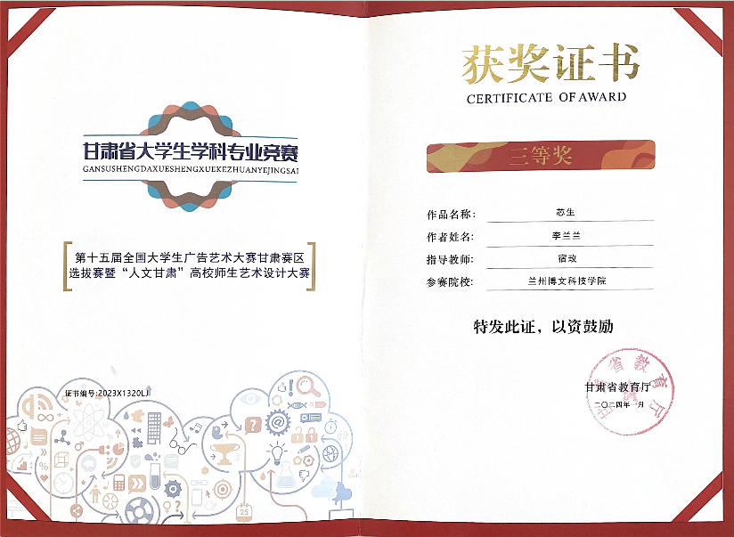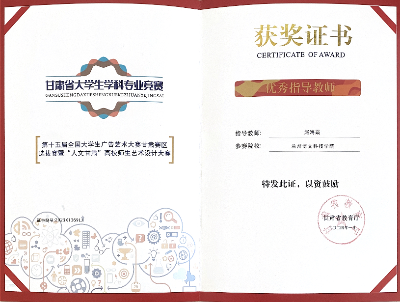 赵海霞老师获得“第15届全国大学生广告艺术大赛甘肃赛区选拔赛暨‘人文甘肃’高校师生艺术设计大赛”优秀指导老师荣誉。