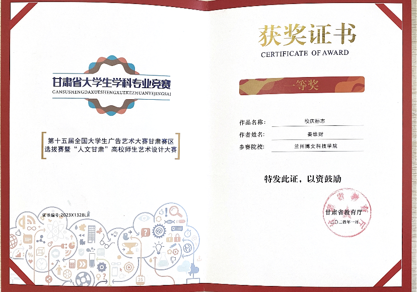 另外,在此次比赛中我院秦维财老师的校庆标志作品获得“第15届全国大学生广告艺术大赛甘肃赛区选拔赛暨‘人文甘肃’高校师生艺术设计大赛”一等奖。