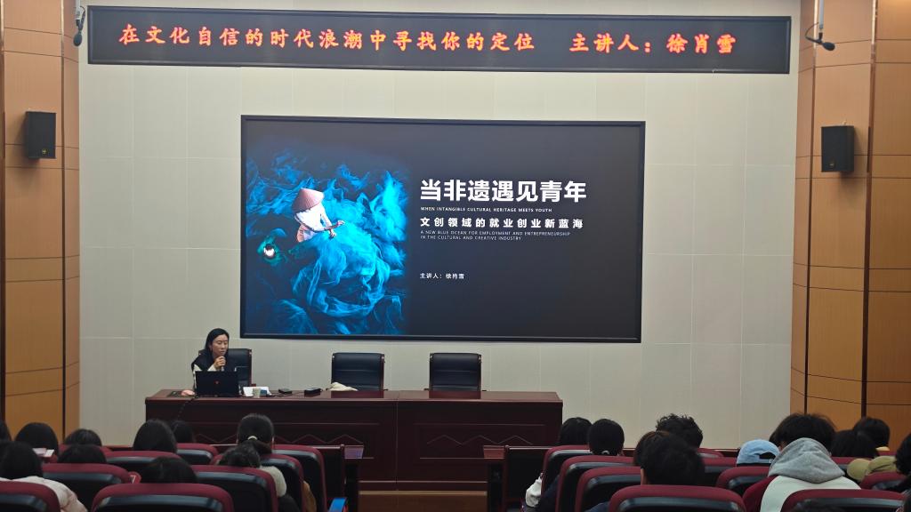 2025 年 11 月 17日,为进一步提升学生对于非遗文化创新价值与跨界融合潜力的认知,以及明晰文创领域就业趋势、拓宽职业发展路径,我院近日邀请中联鑫汇投资集团总经理徐肖雪开展主题讲座,围绕“当非遗遇见青年”主题,解读非遗文创领域的就业创业机遇、能力要求、岗位赛道,为学生投身非遗跨界提供实践指南。讲座由艺术设计学院教师宿玫主持,百余名师生齐聚现场聆听学习。