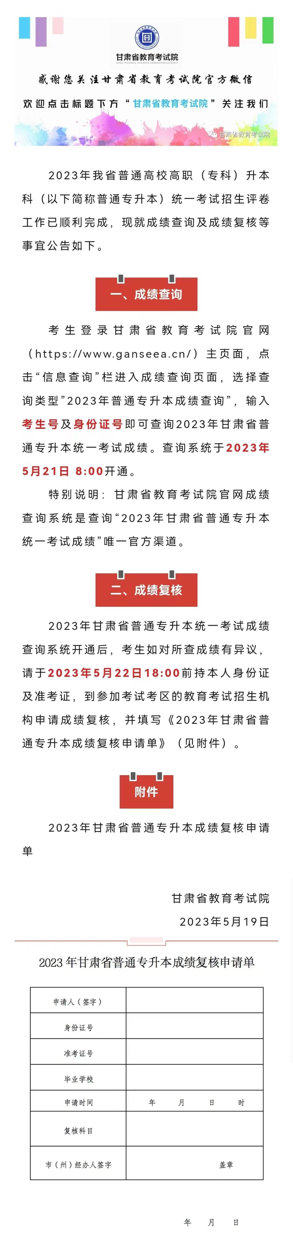 关于2023年甘肃省普通高校高职(专科)升本科统一考试成绩查询有关事宜的公告