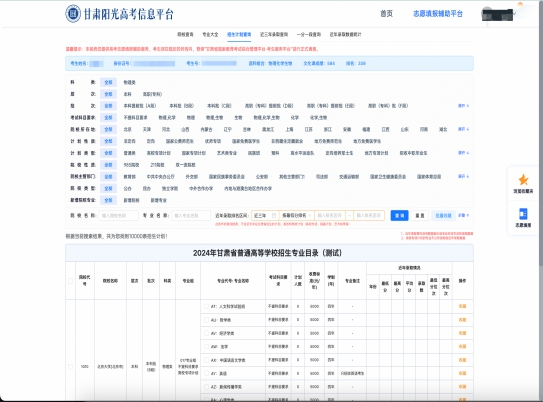 招生计划按照“院校专业组+专业”模式分层展示,方便考生查看。招生计划查询页面为考生提供2024年招生院校及专业的计划并将近三年各个在甘招生的院校及专业的招生计划人数、学制、学费、录取等数据信息与2024年招生专业计划“一对一”对应,查询时自动匹配考生选科所对应的招生计划专业组,以考生的视角构建智能查询需求、路径、关键词等考生急需的信息点,提供多维度智能查询服务。同时考生可选择填报批次、院校所在地、首选科目要求、再选科目要求、院校类型、院校特色、办学性质、主管部门等进行查询和搜索结果筛选(由于2024年甘肃省计划尚未发布,目前为测试数据,计划发布后会及时更新)。