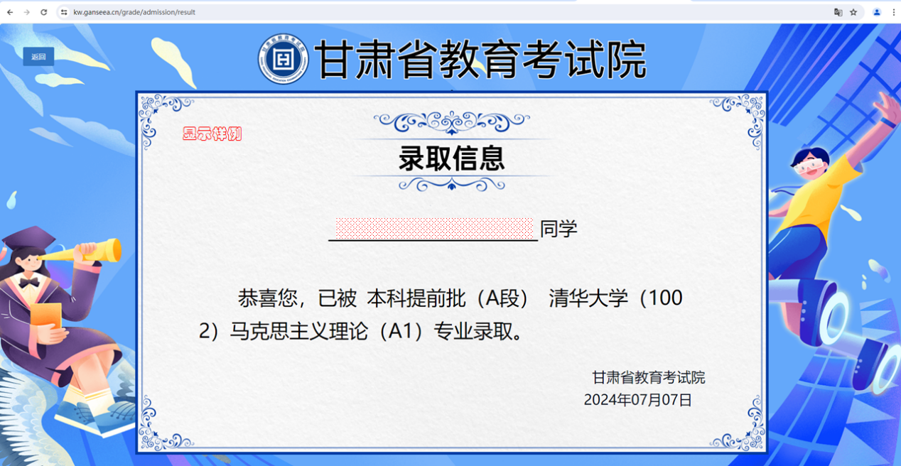 访问甘肃省教育考试院官网:https://www.ganseea.cn,点击“信息查询”模块进入查询页面或直接输入网址https://kw.ganseea.cn/grade/admission进行查询,或点击“综合管理平台”模块,访问“考生入口”并登录后进行查询。