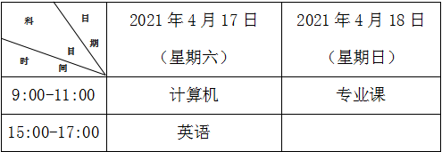 (四)考试时间。全省统一考试时间为 2021 年 4 月 17 日至 18 日。具体考试时间与考试科目安排如下(北京时间):