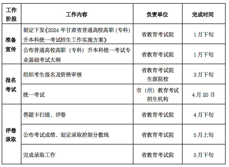 2024年甘肃省普通高校高职(专科)升本科统一考试招生工作进程表