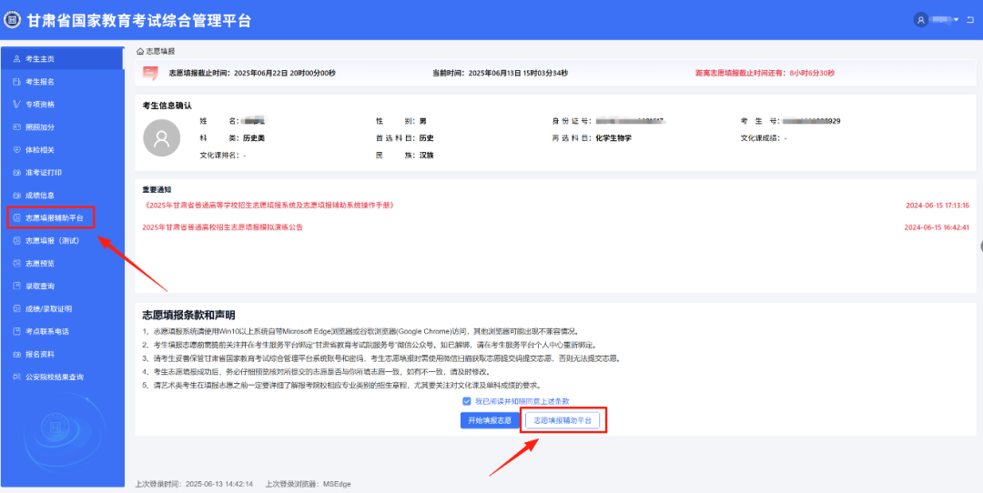 然后点击左侧菜单栏志愿填报辅助平台即可进入志愿填报辅助平台。
